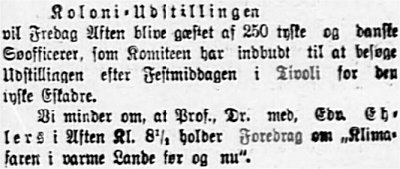 Foreningen “De danske Atlanterhavsøer” har skaffet Komitéen for Udstillingen i Tivoli Tilbud om en Række Foredrag, der skal behandle sociologe og økonomiske Emner fra Island, Færøerne, Grønland og de vestindiske Øer. Kaptajn Rambusch lagde iaftes for med et Foredrag om “Plantevækst og Landbrug i Vestindien”. Mangelfuld Bekendtgørelse var Skyld i en noget ringe Tilslutning fra Publikums Side, og Komitéens totale Mangel paa Arrangementet – Foredraget holdtes i Udstillingens Længdehal, og Publikum maatte staa op – hindrede Tilegnelsen for de fleste.