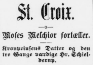Som et sidste, men ikke mindste Udslag af “den nye Tid” findes paa Udstillingen to Billeder, som ingen bør forbigaa. De hænger i Hovedhallen til venstre og forestiller Kronprinsesse Louises Børneasyl paa St. Croix. Billederne taler for sig selv; paa det ene ser man Huset, hvor den velsignelsesrige Virksomhed øves, paa det andet en Stue med velredte, rigtige smaa danske danske Jærnsenge og en Flok sorte Smaabørn, som vogtes af en dansk Diakonisse.