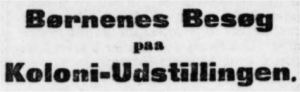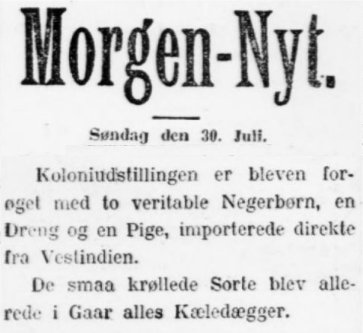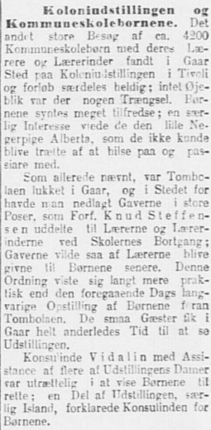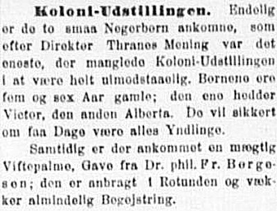 Indenfor Koloni-Udstillingens Komité har der hersket lidt Usikkerhed om, hvad der skulde ske med de to Negerbørn Alberta og Victor, naar Udstillingen idag lukker. Efter mange Overvejelser er Resultatet blevet, at man har henvendt sig til Vajsenhuset, og rimeligvis vil da de to smaa Sorte blive anbragte der og faa en fornuftig Opdragelse og Undervisning. Det er i alle Tilfælde den bedste Løsning; hjemme er der dog ingen, der enten savner dem, naar de bliver her, eller tager sig af dem, naar de kommer tilbage.