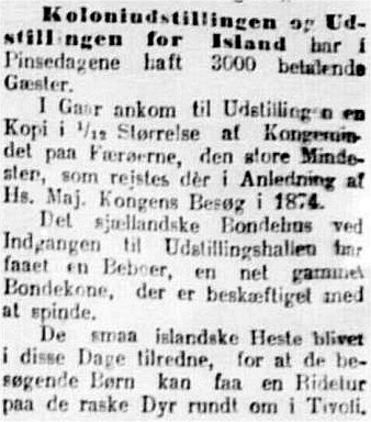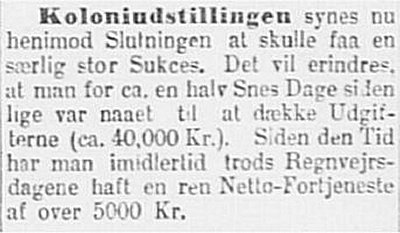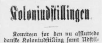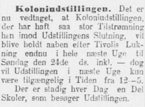 Hvad man saa end vil gjøre derimod, vil det næppe lykkes at faa Kjøbenhavnerne til at nævne den nu i Tivoli aabnede Udstilling fra de danske Kolonier samt fra Færøerne og Island ved andet Navn end “Koloniudstillingen”, hvilket Navn imidlertid er forbudt af Hensyn til de ømfindtlige Islændere. Kunde man saa endda bevæge Publikum til at udelade Hentydningen til Kolonierne og ganske i Almindelighed at tale om “Udstillingen”, vilde det vel delvis kunne tilfredsstille, og nogen Forvexling vil ikke kunne opstaa nu, da Kunstudstillingerne er ved at lukke. Beregnet, som den er, til at vare hele Sommeren, vil den da ogsaa meget vel svare til det Stabile, der udtrykkes gjennem Navnet “Udstillingen”.