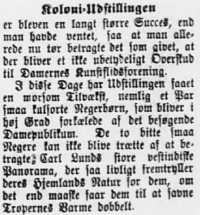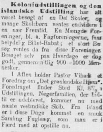 Negerinden er ikke ene om at repræsentere de udstillende Landes Beboere. Baade færøiske og islandske Damer i Nationaldragt gjør Honnør pas deres Hjemøers Vegne, men mest Opsigt vækker dog tre unge Grønlænderinder i deres Sælskindstøj, der i Aabningsdagens stærke Hede af alle tilstedeværende Kjøbenhavnerinder betragtedes som Torturinstrumenter, en Følelse, Bærerskerne ikke syntes at dele.