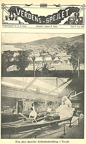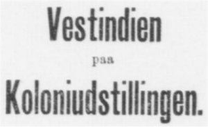 Trods sine Mangler kan det imidlertid ikke nægtes, at den vestindiske Afdelinq pynter paa Udstillingen. De tre smaa Tropeøer giver nemlig en dansk Koloniudstilling et vist Relief. Tropernes Palmer ved Siden af Polarhavets Isbjerge og Sydens svulmende Frugter og pragtfulde Sommerfugle Side om Side med Rensdyrlav, Isbjørne og sælskindsbaade vil ikke undlade at paavirke Sindene, som altid, naar “les extrémes se touchent”, og selv om vore vestindiske Kolonier alt i alt ikke er meget større end Langeland, kan man dog takke dem for, at vi ikke er langt fra at imponere os selv, som er i Stand til at præstere en Koloniudstilling, hvis Omfang naa’r fra Polarkredsen til Ækvator.