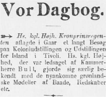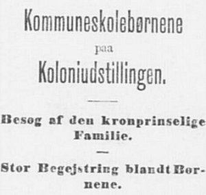 Kronprinsessen, der iforgaars aflagde Besøg paa Koloniudstillingen, indfriede straks igaar et Løfte, hun ved denne Lejlighed havde givet, idet Kammerherre Bull paa Prinsessens Vegne sendte Komitéen 4 Jubilæumstokroner til Fordeling mellem Udstillingens Grønlænderinde og dens Neger og de to smaa Negerbørn. De var alle fire lige vilde af Henrykkelse, da de fik Mønterne, Grønlænderinden var ved at besvime ved Tanken om, at Mønten kom fra selve Kronprinsessen. Negeren erklærede, at han vilde have sin anbragt ved sin Urkæde, og de to Unger fik deres hængt om Halsen under Udstødelse af høje Glædeshyl.