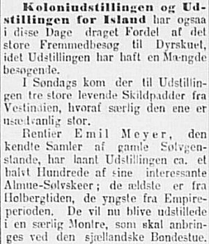 “Jeg ved ikke hvad det bliver til. Direktør Bernhard Olsen vilde kun erhverve den for Musæet, hvis han kunde faa alle de gamle Sager med i Købet, og vi har netop i disse Dage fra Færøerne faaet et Brev, som giver alt andet end klar Besked. Folkemusæet har forøvrigt købt en Del paa Udstillingen, og Salget er i det hele gaaet ret livligt.
