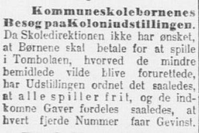 – Ih, jo! Forstaa mig ret, det er kun Børnene, vi savner. Vi synes, at denne Udstilling bør beses af de flest mulige Børn, og af den Grund har vi besluttet at lade Skoler slippe ind mod en Entré af 10 Øre pr. Barn, medens Lærerne gaar frit.