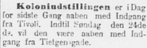Opbruddet fra Koloniudstillingen er nu i fuld Gang. Store Sendinger er alt bragt bort fra Udstillingen. I Dag og i Morgen hjemtager de kjøbenhavnske Udstillere deres Ting.
