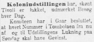 De ikke faa Salgsgenstande samt Tombolagevinster, som er blevne tilbage, vil i den kommende Uge dels blive solgte, dels bortavktionerede af “Dansk Kunstflidsforeniing”.