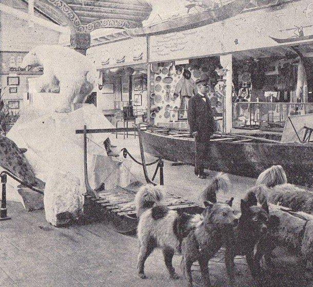 Bekjendt er det ogsaa, at man nu mener med held at kunne udnytte de grønlandske Kullejer, i al Fald til Koloniernes eget Brug. Den anden Udligger er en Samling af Pelsværk fra Bundtmager A. C. Bang, beregnet paa at vise, hvad der af den Vare kan hentes i Grønland. Her er selvfølgelig baade Edderfugle- og Isbjørneskindstæpper, men navnlig er det Blaaræven og Polarræven, der dominerer. Som et sjældent pragtfuldt Midterparti i Samlingen maa nævnes en Damejaket mod tilhørende Muffe af Sælskind, en helt ny Anvendelse af dette Skind, der imidlertid efter denne Prøve synes fortræffelig egnet dertil. Forretningen i grønlandsk Pelsværk har i de senere Aar været i stærk Fremgang, navnlig til udenlandske Kunder. Bundtmagerne søger mærkelig nok Grunden til, at den ikke tidligere er kommet op, deri, at Priserne tidligere har været holdt altfor lave. Nu er de paa Højde med den store Verdens. I Hr. Bangs Montre opgives der alene at være for over en Snes tusinde Kroner Pelsværk.