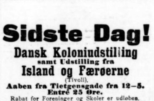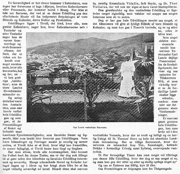 Og der er ingen Tvivl om om, at denne smagfulde og righoldige Udstilling af Liv og Frembringelser paa Færøerne, Grønland og Vestindien, samt Island, der hævder sin Særstilling i en særlig Bygning, vil avle megen Forstaaelse og Interesse.