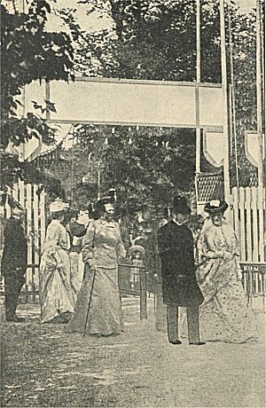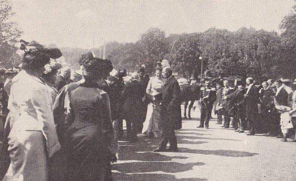 Præcis Kl. 3 kørte en Række kongelige Ekvipager frem foran Udstillingens Indgang fra Tivoli, og faa Øjeblikke efter traadte følgende Herskaber ind paa Udstillingens Terræn: Hs. Maj. Kong Georg af Grækenland, Drs. kgl. Højh. Kronprinsen og Kronprinsessen, Prinsesse Victoria af England, Hs. kejserl. Højh. Storfyrst Mikhail af Rusland, Drs. kgl. Højh. Prinsesse Louise af Schaumburg-Lippe, Prins Christophoros af Grækenland, Prinsesse Dagmar og Hs. Højh. Prins Friedrich af Schaumburg-Lippe med Følge. Kronprinsessen var iført en terrakottafarvet Spadseredragt, de øvrige Damer var i lyse Spadseretoiletter. De kongelige modtoges og førtes omkring af Udstillingens Præsident, Grosserer Moses Melchior, Forf. Admiralinde Emma Gad, Etatsraadinde Louise Hansen, Konsulinde Vidalin, Kammerherre Krogh, Direktør Ryberg, grønlandske Handel, og Forf. Knud Steffensen.