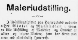 I Udstillingslokalet paa Højbroplads aabnede d’Hrr. Winkel og Magnussen i Gaar en lille Udstilling af Malerier og Studier af ældre og nyere Malere, som har krav paa mere end almindelig Interesse.