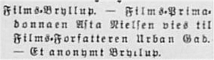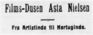 Asta Nielsen er Filmens Duse, Hendes Gabriele d’Annunzio hedder Urban Gad. Naar hun ikke staar paa Plakaterne, men i sin Svigermoder, Admiralindens Hjem, hedder hun selv Asta Gad.