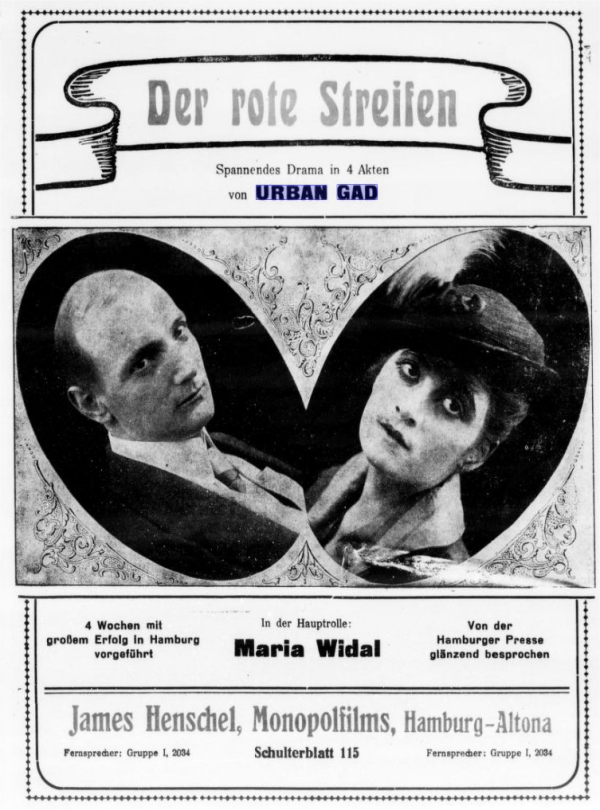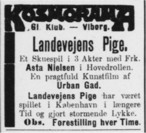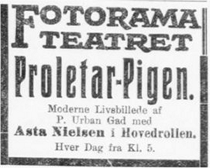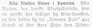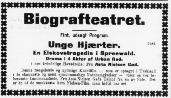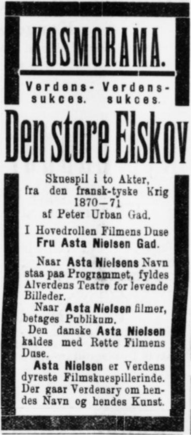 I alle Lande, civiliserede og eksotiske, pranger nu hendes og Urban Gads Navne paa Kæmpeplakater, og en statistisk Opgørelse har vist, at gennemsnitlig halvanden Million Tilskuere daglig ser hende i ca. 600 Teatre, hvoraf adskillige i Tyskland bærer Navnet: Asta Nielsen Lichtspiele.
