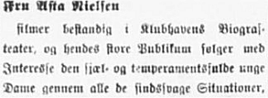 Naar Asta Nielsen straks i de levende Billeder gjorde saa udmærket en Figur, var det til Trods for, at der var ikke saa lidt i Vejen med hendes egen. Dog skyldtes det maaske netop hendes Magerhed, at hun blev saa godt en Ben for det Selskab som engagerede hende. Tiden krævede nemlig det smækre.