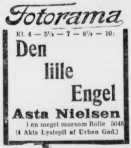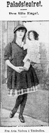 Paladsteatret havde I Aftes Premiere. Efter en Række mindre Numre, deriblandt et morsomt Behændighedseksperiment “Lulu vil have Hund”, præsenteredes en ny Asta Nielsen Film af Urban Gad. Den var rigtig nydelig. “Den lille Engel” handler om en ung Pige, som af lidt underlige Aarsager skal foregive at være 12 Aar for at arve en Onkel. Hun maa gennemgaa Barnealderens Kvaler og Glæder om igen i en stumpet Kjole og helt skrue sin Udvikling tilbage til svundne Dukke-Tider.