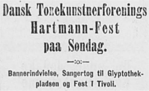 Tivoli faar efter alle Solemærker at dømme paa sin Aabningsdag paa Søndag tillige en af “Sæsonen 1905″s allerstørste Dage. Takket være den Omstændighed, at J.P.E. Hartmann fødtes den 14. Maj 1805 og at “Dansk Tonekunstnerforening” ganske naturligt har følt det som en kær Pligt at fejre denne Mindedag ved en stor Fest.