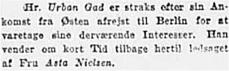 Som meddelt ankommer i Aften Asta Nielsen Gad og Urban Gad her til Byen og agter en Maaneds Tid at tage Ophold paa Admiral og Admiralindens Villa i Humlebæk. Nogen egentlig Ferie er det dog ikke. Det bekendte Kunstnerpar ledsages nemlig hertil af en hel Trup, bestaaende af 6 tyske Skuespillere og 4 Teknikere, og endvidere medfølger Dir. Falck, Lederen af det store Selskab, der optager alle Asta Nielsens Films. De tyske Skuespillere vil blive indkvarterede paa Humlebæk Hotel.