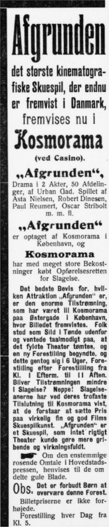 Da alt syntes at være paa det værste og alle Sunde lukkede, fik hun og hendes nuværende. Mand, Urban Gad, der som Følge af en Teaterkatastrofe ligeledes stod paa bar Bund, den Idé at lave en Film sammen, saaledes at han skrev den og satte den op, og hun spillede Hovedrollen. Den hed “Afgrunden”, gik paa Kosmorama og gjorde allerede her i Byen stor Lykke, fordi det var den første originale Film, der baade i Retning af Spil og scenisk Tilrettelægning var Præget af kunstnerisk Kultur. Herfra gik den paa Vandring rundt i Landene og mange Penge tjentes paa den, ikke af de to Hoved-Udøvere, men af dem, der handlede med den. LÆS HELE ARTIKLEN