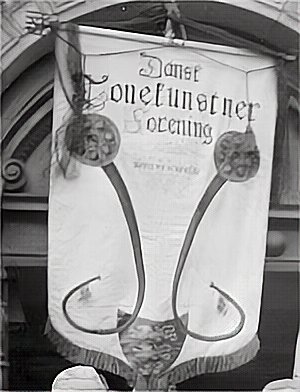 Naturligvis vil de forskellige Studenter- og Sangforeninger, af hvilke det store Felttog kommer til at bestaa, give Møde med deres velkendte Faner og Bannere. Nær kunde imidlertid selve Ophavet til det hele, Tonekunstnerforeningen, være kommet til som en fattig Per Eriksen at maatte søge ind under et fremmed Flag, fordi de intet selv ejede. Denne Kalamitet er dog vistnok i sidste Øjeblik afværget, idet 25 musikinteresserede Damer, for en Del Medlemmer af Foreningen, for nogen Tid siden traadte sammen i Komite med det smukke Formaal at skaffe “Dansk Tonekunstnerforening” et Banner. Det lykkedes at faa samlet de fornødne Midler. Urban Gad lavede Tegningen og “Dansk Kunstflidsforening”s Damer paatog sig Arbejdets Udførelse.
