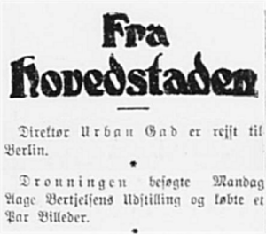 Vi husker en Komedie, han sammen med sin Moder, Admiralinden, havde skrevet til Det ny Teater. Den hed saadan noget som “Fruens Politik”. I denne Komedie forekom det første Varsel for den Løbebane, som Urban Gad skulde slaa ind paa. Paa et nedrullet Rullegardinslærred udspilledes en Skyggescene, hvor to Elskendes gensidige Tilbøjeligheder afsløredes paa en uomtvistelig Maade.