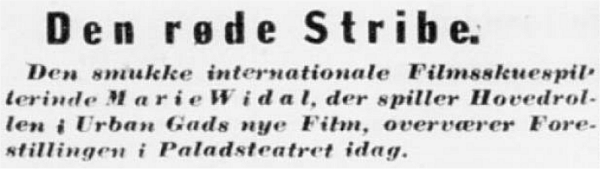 Klokken halvfire i Eftermiddag, naar det første Billede i Urban Gads nye Film “Den røde Stribe” bliver kastet over paa Paladsteatrets store Lærred, sidder en ung, nydelig Dame af et udpræget kosmopolitisk Ydre i Fremmedlogen og ser spændt og maaske en lille Smule angst ud over Logeranden.