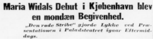 – – Maria Widal fortalte igaar “B. T.”, at hun var angst for Kjøbenhavnerne. Iaften var Fruen ikke angst mere – hun straalede lykkelig. Kjøbenhavnerne tog imod hende med Bifald og Blomster og mange Lykønskninger til hendes Succes. Smuk havde hun vundet sit Navn blandt de Primadonnaer, der ejer Byens Hjerte, og vi tror hun vil bevare det.