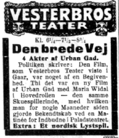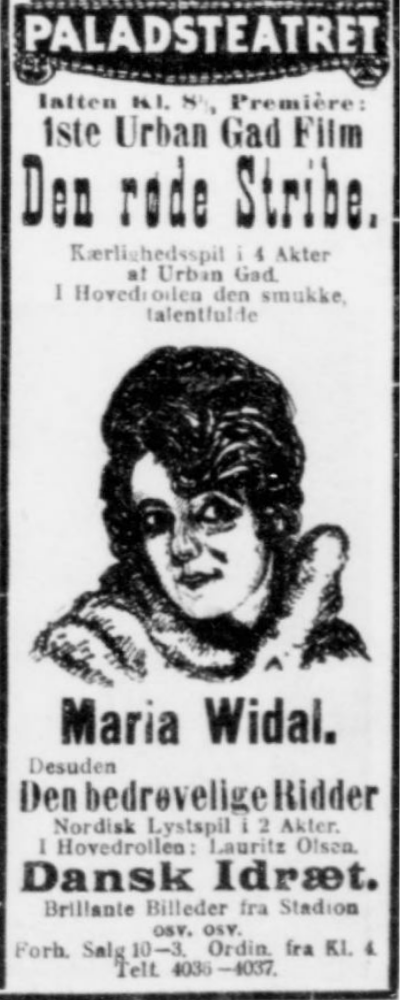 Vesterbros Teater opfører for Tiden en Film af Urban Gad iscenesat af Forfatteren selv og skrevet for den smukke Maria Widal, hvis ejendommelige Ynde hurtigt er slaaet an blandt Filmens Publikum.