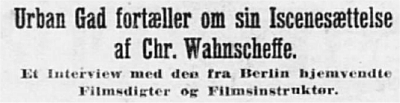 Igaar er Urban Gad kommen hjem fra Berlin efter at have tilendebragt Iscenesættelsen af en Filmatisering af Wassermanns store, berømte Roman “Chr. Wahnscheffe”.
