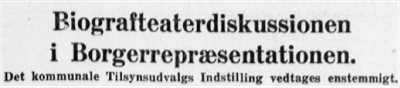 Angsaande Enkeltheder I Debatten om Biografteatrene, henviser vi til efterfølgende Referat. Som tidligere omtalt, gaar Biografteaterudvalgets Indstilling ud paa, at de nu udløbne 17 Bevillinger fornyes for en ny treaarig Periode, at Systemet med Dobbeltbevillinger ændres, og at der ved Lovens forestaaende Revision søges tilvejebragt saadanne Lovregler, at Muligheden for at haandhæve Lovens Bestemmelser ikke paa væsentlige Omraader er udelukket.