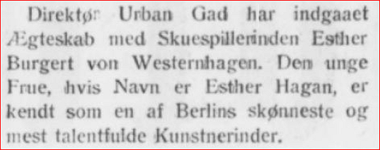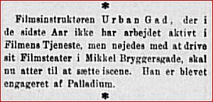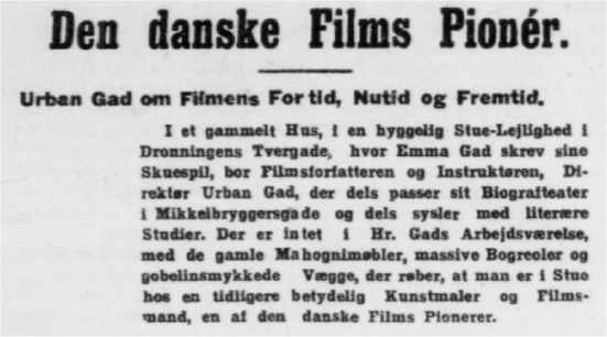 Endelig har Hr. Urban Gad sammen med Borgerrepræsentant Frk. Damgaard faaet Ret til at anlægge et Strøgteater, skønt der vist eksisterede et gammelt Løfte om, at der ikke maatte komme flere Billedteatre paa denne Strækning.