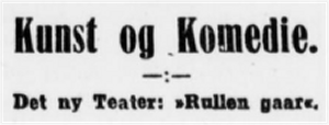 Anonymiteten er paa Mode. Fra det kgl. Teater og nedefter. Man fristes uvilkaarlig til en Smule forundret at spørge hvorfor, eftersom Anonymiteten sjældent varer fra Sol staar op, til den gaar ned. Undertiden næppe endda saa længe. Det ny Teaters ny Forestilling, “Rullen gaar”, lider i saa Henseende af samme Skavank som sine Forgængere. Endnu før Tæppet gaar op, er den anonyme Forfatter afsløret som identisk med Filmsinstruktøren Peter Urban Gad, og “Rullen gaar” er en sønlig Bearbejdelse af et ufuldført Manuskript, Fru Emma Gad efterlod sig. Fru Gad havde en vis Evne til at skrive for Scenen, og den i Forbindelse med Urban Gads sceniske Teknik har ført til en Folkekomedie, der nærmest maa karakteriseres som en moderne Udgave af Sudermanns for 20 Aar siden saa populære “Forhus og Baghus”. Sceneriet er det samme, Udviklingen og Handlingen traditionel, naar man undtager sidste Akts Interiør fra en Filmsfabrik med tilhørende Pudsigheder baade i Sceneri og Aktører. Ellers er det hele Historien fra Sudermann om igen: Pigebarnet fra Kælderen, der borte fra Hjemmet gør Karriére, indtil det hele ender i den Fryd og Gammen, en Folkekomedie nu engang fordrer.