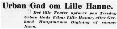 – Jeg tale aldrig om mine Film, siger han, aldrig i mit Hjem, og for resten nødigt. Man skal ikke snakke for meget om sin Metier, men Lille Hanne har interesseret mig. Jeg saa jo Stykket paa Dagmarteatret, først med Caroline Aagaard og senere med Anna Larsen. Hvem der var størst, véd jeg ikke, men det véd jeg, at det Indtryk, Hauptmanns skønne Digtning gjorde paa mig, ja det har jeg levet videre i min Erindring, i min Fantasi. Nu skal Stykket gaa igen paa Det ny Teater med Grethe Bendix – i Hr. Ivar Schmidts Iscenesættelse.