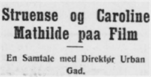 – Det franske Selskab Gaumont, med Hovedrollerne spilles af de tyske Kunstnere Henny Porten og Harry Liedtke; den første er Dronning Caroline Mathilde, den anden Struense. En af Lessingteatrets bedste Kræfter Walther Jansen, spiller Kong Christian den 7., og desuden forekommer ogsaa Enkedronning Juliane Marie i Filmen.