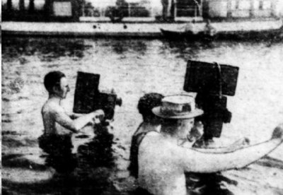 Palladium er ved at indspille en ny Film. Her ses Urban Gad, der iscenesætter den, sammen med “Fyrtaarnet” og “Bivognen”.[/caption]