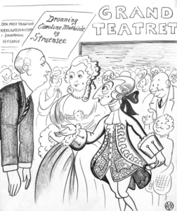 Foran et fyldt Grand Teater står biografdirektør, Gad og taler med Christian VII og Caroline Matilde. Bag dem hænger paklater med skriften “Dronning Caroline Matilde og Strueense” og “Den mest tragiske kærlighedshistorie i Danmarkshistorien”.