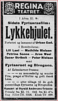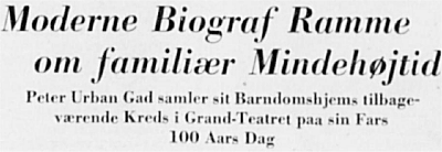 Direktør Peter Urban Gad og Frue udsender i disse Dage Indbydelser til en snæver og ældre Kreds af det københavnske Borgerskab til en familiær Mindehøjtid i Biografen Grand-Teatret paa næste Søndag den 20. December. Begivenheden finder Sted om Formiddagen og vil ifølge sin intime Karakter være forbeholdt omkring 60 Indbudte, alle Venner og Slægtninge af Huset Gad.