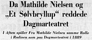 Mange ældre Københavnere vil i Aften sætte sig tuk Højttaleren og nikke genkendende til Emma Gads “Et Sølvbryllup”, og frem i deres Erindring vil stige Minderne fra muntre Teateraftener og glimrende Skuespillere, maaske især Sophus Neumann som Grosserer Selby og hans søster Mathilde Nielsen som Frøken Knudsgaard. Hvordan det gamle Skuespil vil gøre sig i Radioens Udgave, vil vise sig i Aften, men der er een Ting, som gør Opførelsen til en Begivenhed: Fru Mathilde Nielsen spiller den samme Rolle i Dag som i 1889, da Sølvbryllup’et havde Premiére hos Riis-Knudsen paa Dagmarteatret. Forfatterindens søn, Direktør Peter Urban Gad, siger om sin Mors Skuespil: