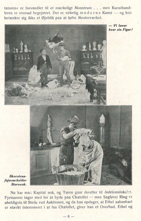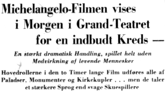I Morgen Eftermiddag samler Esther og Peter Urban Gad i Grand-Teatret en lille udsøgt Skare af den kulturbetonede Filmskunsts Venner og ruller for dem Michelangelo-Filmen… lader fra det lysflimrende Lærred Peterskirkens Pietâ, Louvres Slaver, Det sixtinske Kapels Sibyller og Profeter, Il Pensiero fra Mediciernes Gravmæle, Mose, alle Værkerne forklarede ydre Begivenheders Indvirkning paa Mesterens Sjæleliv. En Tragedie om en Gigant indenfor Kunstens Verden, det største af alle billedskabende Genier – for saa vidt Genier ikke alle er lige store! – udspilles, men Rollerne er ikke fordelt mellem svage Aktører, de betros i dette Tilfælde kun til Paladser, Monumenter, Kirkekupler. Og det mærkelige er: Stenene spiller mere gribende end mennesker.