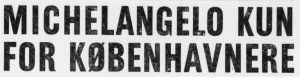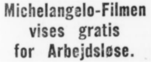 Komiteen til Afholdelse af Museumsforedrag for Arbejdsløse har den Glæde at meddele, at Arbejdsløse ved Direktør Urban Gads Velvilje faar Lejlighed til at se den fremragende Kulturfilm om Michelangelo, der for Tiden spilles i Grand Teatret i Mikke Bryggersgade.