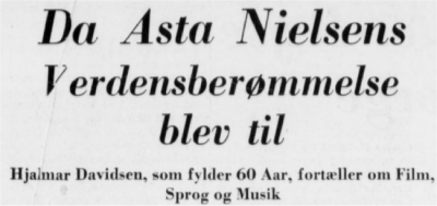 At tale med Hjalmar Davidsen, den den 2. Februar fylder 60 Aar, er som at blade i en stor og morsom Bog om dansk Films Barndom. Hjalmar Davidsen der startede i sin Tilværelse som islandsk Købmand, er en god Fortæller, og han har oplevet en Mængde morsomme Ting i sit Liv. Selv om han nok “sad fast” som Biografdirektør, fik han ogsaa Tid til at beskæftige sig med saa meget andet. Først og fremmest med Filmsinstruktion – og siden med Sprogforskning og Musik.