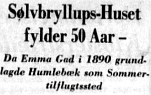 Efter Admiralindens Død overtog hendes Søn, Direktør Peter Urban Gad, Ejendommen. Den er senere Aar for Aar blevet udvidet — der har været god Grøde i de Sølvbryllups-Penge! – men alle Ombygninger er gaaet uden om Emma Gads Skrivekrog med det beskedne, gammeldags Arbejdsbord. Hendes Valgsprog er nu indmejslet i Trinet up til den aabne Kamin i Solgaarden. Her star ogsaa hendes Buste, de klare og faste Træk, støbt i Bronze af en norsk Billedhuggerinde. Emma Gad har grundlagt Humlebæk som Badested og Sommertilflugt. Et Sølvbryllup blev den tilfældige Aarsag, og i Huset bag de knaldblaa Laager vil Mindedagen blive fejret af Admiralindens Sønner den 29. Juni.
