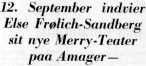 I Anledning af, at Fru Else Sandberg har faaet Bevilling til at drive Merry-Teatret, afholdtes der i Aftes hos Direktør Peter Urban Gad og Fru Esther Gad en Middag til hendes Ære. Der var udelukkende indbudt Damer, og bl. a. deltog Fru Udenrigsminister, Folketingsmand Elna Munch.