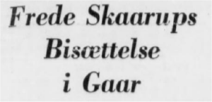 I Gaar Eftermiddags bisattes Frede Skaarup fra Mariendals Kirke. Efter en kort Højtidelighed i Hjemmet var Kisten blevet ført til Kirken, fulgt af en mindre Kreds af Frede Skaarups nærmeste Slægt og Venner til Fods. Den brune Moseegkiste var enkelt smykket med en stor Buket mørkerøde Rosenknopper, der helt dækkede Kistens Laag. Koret, ved hvis Fod Kisten stod, var skønt pyntet med hvide Syrentræer, Pilegrene og grønne Ranker med hvide Anemoner. I store Kandelabre brændte levende Lys.