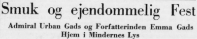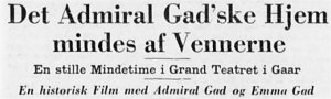 Den begyndte om Formiddagen i Grand Teatret, hvor kun de allernærmeste Venner af det Gad’ske Hjem i Dronningens Tværgade var kommet til Stede. I en lang Aarrække fra Aarhundredeskiftet til efter forrige Verdenskrig var det et Kulturhjem, der betød noget lignende for sin Tid som det Heibergske Hjem paa Søkvæsthuset et halvt Sekel tidligere. Admiralen var den danske Flaades ridderligske Skikkelse og Fru Emma Gad, selv en talentfuld Forfatterinde, blev Drivkraften inden for Kvindebevægelsen og det sociale Arbejde. Ingen ængskelig ung Digter og ingen fattig Vaskerkone bankede nogen Sinde forgæves paa hendes Dør.