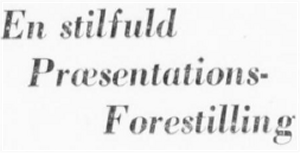 Forinden vil der dog Tirsdag Aften finde en Forestilling Sted for en indbudt Kreds – og denne Gang foregaar Forevisningen i Odd Fellow-Palæet. Under Protektion af Hs. kgl. Højhed Prins Axel er der blevet dannet en Komité bestaaende af Borgmester, Dr. Ernst Kaper, Generalkonsul Langkjær, Direktør Gad, Chefredaktør Svend Aage Lund og Redaktør Jørgen Bast – det er denne Komité, der staar for det specielle Arrangement Tirsdag Aften.