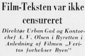 Direktøren for „Grand-Teatret” I Mikkelbryggersgade, Peter Urban Bruun Gad, mødte i Dag i Byrettens 1. Afdeling hos Dommer Jacobi i Anledning af, at der til Filmen „Veritas forhekser Byen”, som „Grand” opførte i August, var tilføjet en forklarende Tekst paa ca. 50 Meter, som ikke var censureret. Samtidig var tiltalt Kontorchef Arnold Olsen, fordi han var medansvarlig for, at Teksten ikke var censureret.