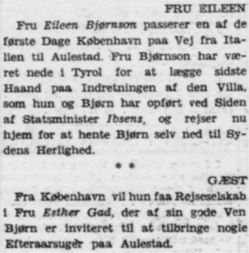 Det sidste Par Aar var det tyndet ud blandt Bjørn Bjørnsons københavnske Venner. Frede Skaarup var død. Johannes Poulsen var død – men til det sidste talte Bjørn Bjørnson om sin Længsel efter at komme ned og hilse paa dem af Vennerne, der var tilbage, først og fremmest Urban og Esther Gad og Overlæge Blegvads.