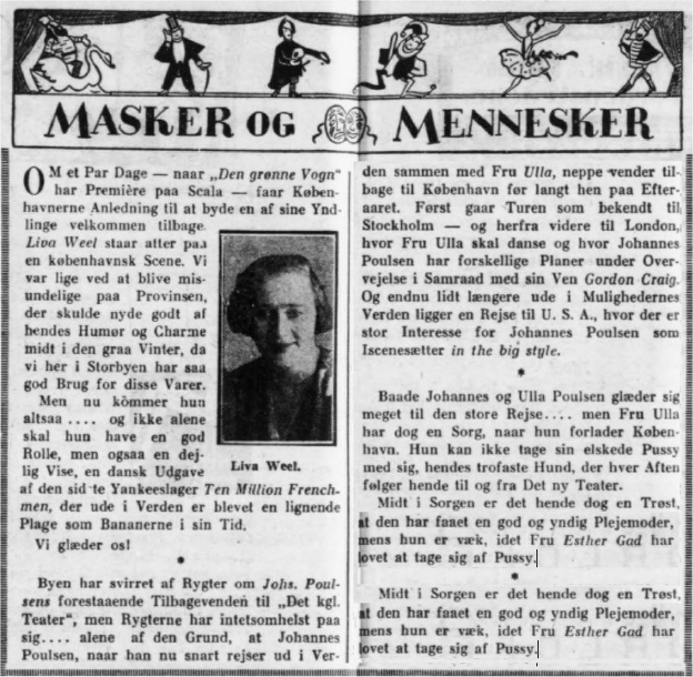 Efter Forestillingen Tirsdag Aften har “Berlingske Tidende” indbudt til en Fest for Leni Riefenstahl. Hun vil være Æresgæst under Besøget i København. Ankomsten finder Sted allerede paa Søndag – og om Eftermiddagen har Direktørparret Gad indbudt til en Eftermiddags-Reception i deres Villa i Humlebæk.