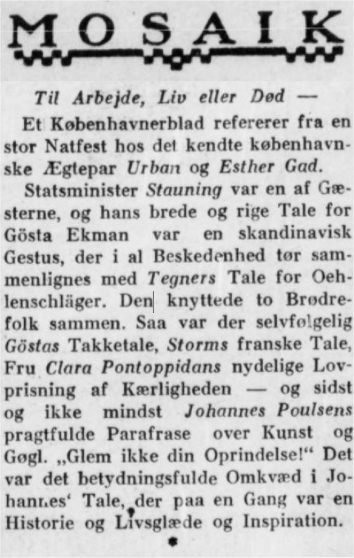 Selvfølgelig var det Bjørn, der holdt Nattens første Tale, men derefter gik det Slag i Slag. Jeg kunde berømme mange af de Cicero’er, der rejste sig i Skæret af Nell Gwyn-Kandelabrene, men jeg vil holde mig til de Taler, der vil blive husket om mange Aar. Statsminister Stauning var en af Gæsterne, og hans brede og rige Tale for Gösta Ekman var en skandinavisk Gestus, der i al Beskedenhed tør sammenlignes med Tegners Tale for Oehlenschläger. Den knyttede to Brødrefolk sammen. Saa var der selvfølgelig Göstas Takketale, Storms franske Tale, Fru Clara Pontoppidans nydelige Lovprisning af Kærligheden – og sidst og ikke mindst Johannes Poulsens pragtfulde Parafrase over Kunst og Gøgl. “Glem ikke din Oprindelse!” Det var det betydningsfulde Omkvæd i Johannes’ Tale, der paa en Gang var Historie og Livsglæde og Inspiration.