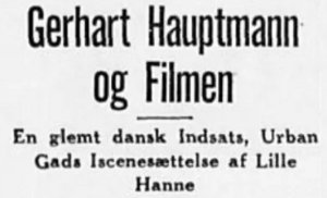 I Dag paa Gerhart Hauptmanns 80 Aars Fødselsdag er der Grund til at mindes en dansk Filminstruktørs Værk; for tyve Aar siden iscenesatte Direktør Urban Gad i Berlin et af Hauptmanns betydeligste Værker, Lille Hanne. Det var i Stumfilmens Dage. At omsætte et saadant Digterværk i Billeder uden Ord var en meget stor og vanskelig Opgave; Instultøren havde Grund til at føle sig benovet ved at fjerne Digterens malende Ord og helt forlade sig paa sit Kamera og Stumfilmens Teknik.